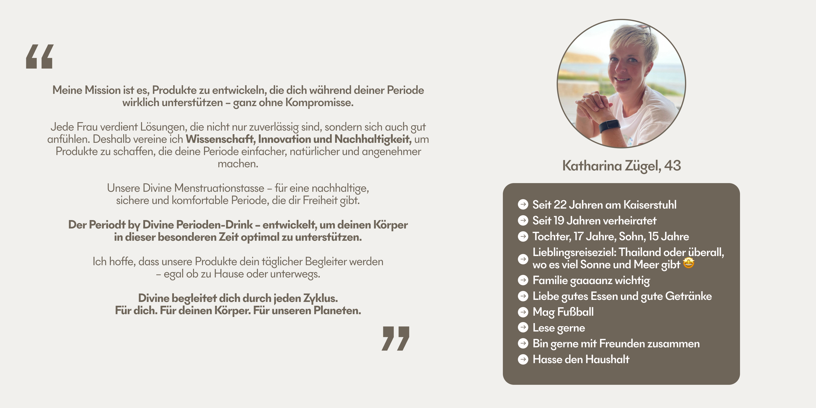 Svenja ist nicht nur Teil unserer Divine-Community, sondern lebt genau das, wofür wir stehen: echte Werte, starke Frauen und ganz viel Herz. Für sie steht die Familie an erster Stelle – ihre kleine Tochter ist gerade mal ein halbes Jahr alt und bringt jeden Tag neue Magie in ihr Leben. Sie liebt es, Zeit mit Freunden zu verbringen, gutes Essen zu genießen und ihre Leidenschaft für den Fußball auszuleben – nicht nur als Zuschauerin, sondern auch als ehemalige Spielerin. Nur bei einem Thema ist sie kompromisslos: Meeresfrüchte? Nein, danke! Wir lieben ihre ehrliche, lebensfrohe Art – und freuen uns riesig, sie als Teil unseres Teams zu haben!